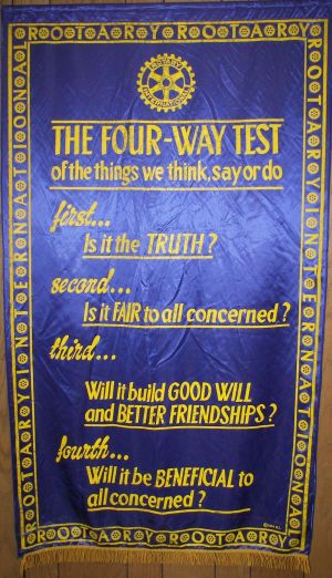 The Rotary of Star Valley club has a large banner of the 4-way test hanging at all of our meetings too remind us of how inportant this is. A picture of our banner is to the left. Click on it to see an enlargement (sorry for the poor photography).